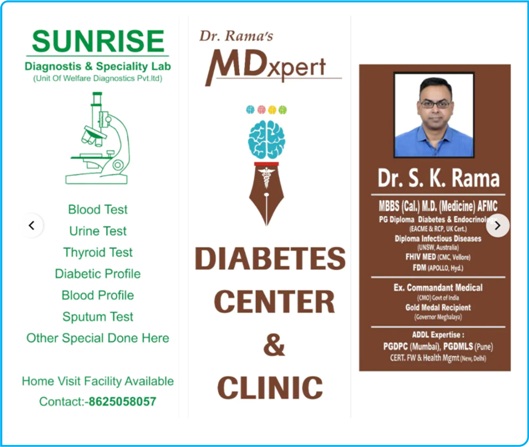 Welcome to our clinic, My name is Dr S K Rama and I am MBBS & M.D. (medicine) AFMC also specialised in Advanced Diabetes Care, Infectious Disease & Obesity / Weight Management. I am providing OPD Consultaion for BP/ Diabetes / Thyroid Disorder, Obesity / Heart & Gastro/ Neuro, Infections / HIV / Hepatities B/C/A and Kidney & Heart Diseases etc.